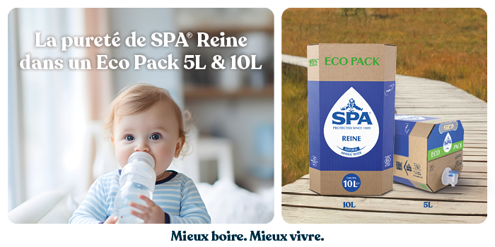 Notre Eco Pack vous offre toute la pureté de SPA® Reine dans un emballage pratique de 5 litres ou 10 litres. Grâce à son format compact et à son robinet, il est adapté à toute la famille et est facile à utiliser. De plus, le SPA® Reine Eco Pack contient 65 %* de plastique en moins et est entièrement recyclable.