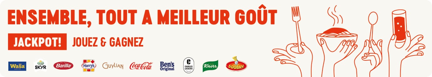 Remportez un Flash e-Deal avec ce Jackpot ! Vous pourrez vous régaler avec des marques super sympas comme : Arla, Wasa, Harry’s, Barilla Pesto, Coca-Cola, Charles Liégeois, Guylian, Ben’s Original, Soubry et Knorr. N'hésitez pas, car avec ce Jackpot, vous gagnez toujours.