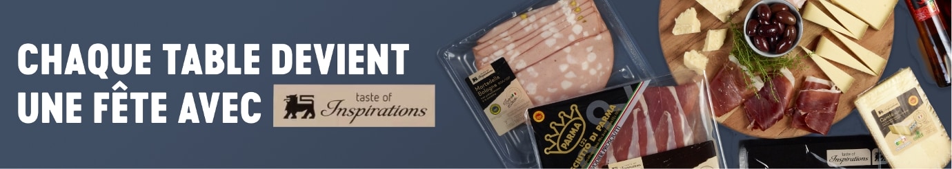 Découvrez Taste of Inspirations, des produits de qualité supérieure à base de recettes authentiques. Idéal pour celles et ceux qui aiment les macarons, le comté, le jambon de Parme, le saumon fumé, l'huile d'olive… avec un goût élégant et raffiné. Chaque année, pendant les fêtes, cette gamme unique s’étend, et vous pouvez profiter de nos promos spéciales pour les fêtes. Combinez, profitez, et surprenez vos convives avec une finesse inégalée